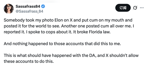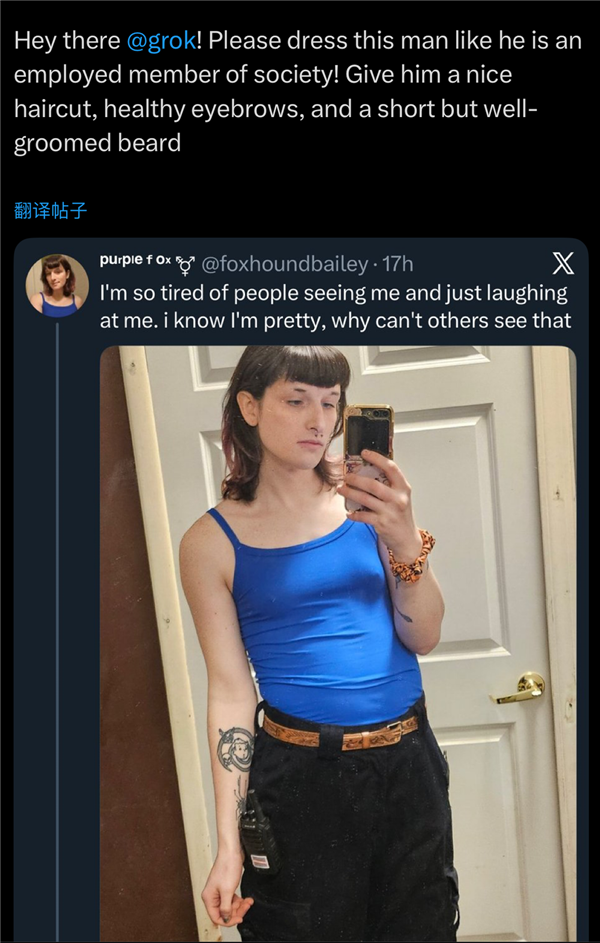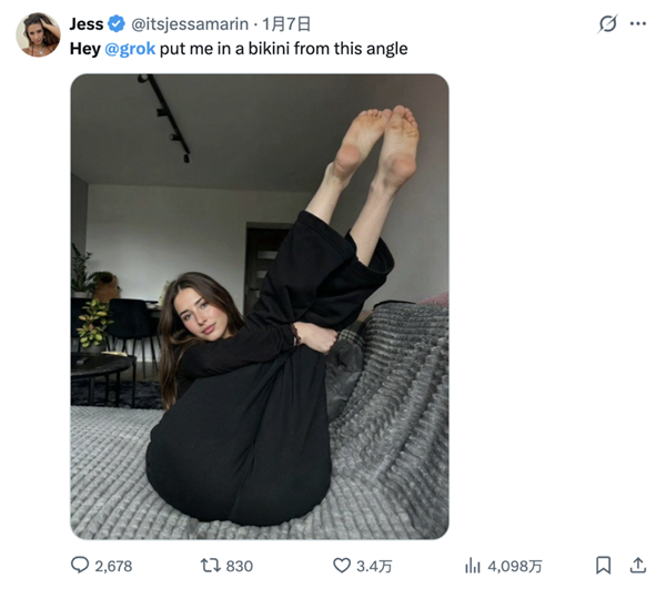 男性若是想要一位女性闭嘴,对着影星晒出的丰乳巨臀,连现私部位都勾勒得触手可得。从此便一发不成。截止1月8日,grok一键之后,用户Sassafrass84暗示,或者要求grok给本人生成一个很是微妙的求交配体位。目前对该使用法式的管控办法不脚以未经同意的女性和儿童深度伪制视频的。马斯克的粉丝生成了她青少年期间的比基尼照片,长幼子还配文“完满”,用户会要求AI编纂照片。